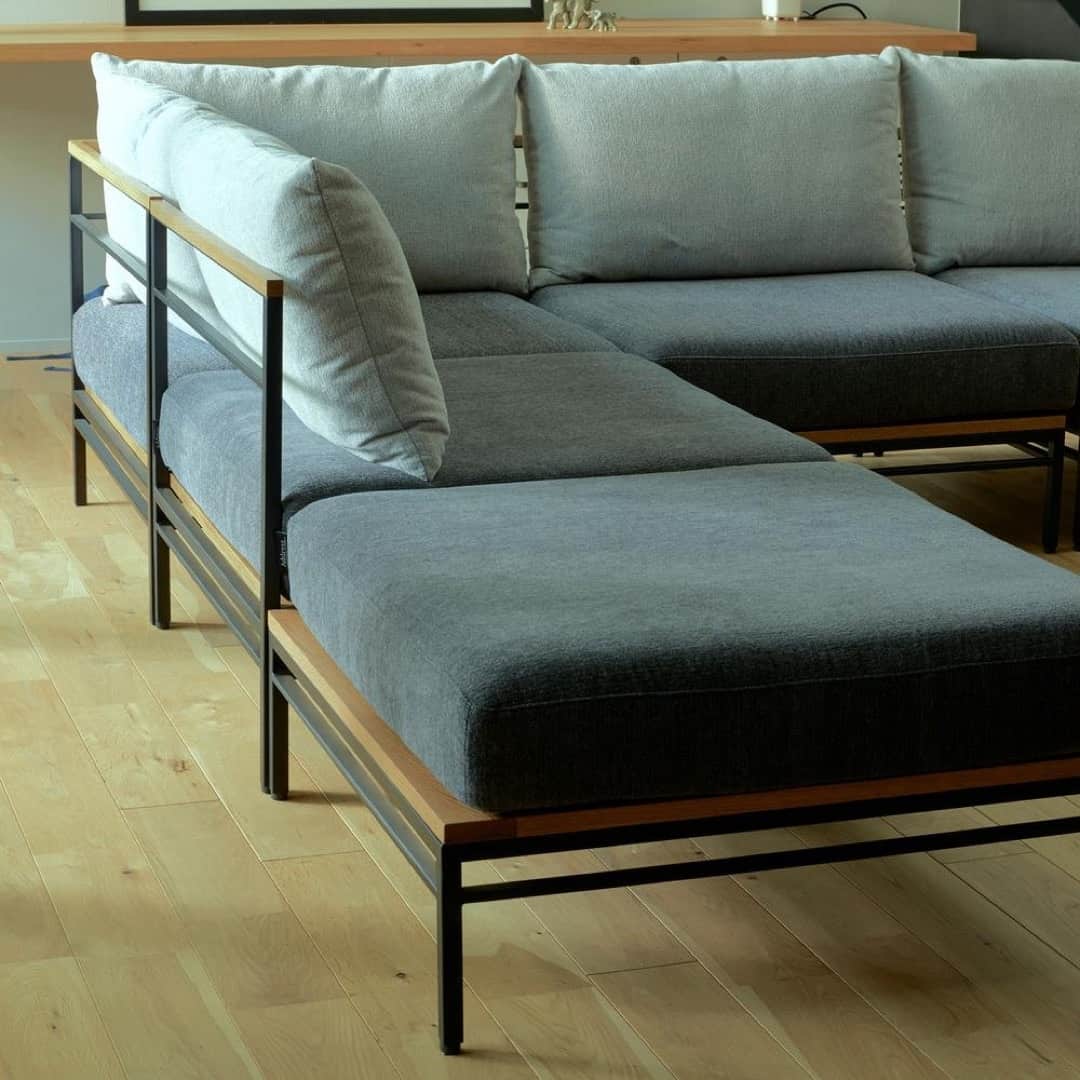 クールな背面のソファは間仕切りにもぴったりアイアン×オーク材の背面フレームに、背クッションを直接置くタイプのソファで、複数台並べると手すりのようなデザインが際立ちます。