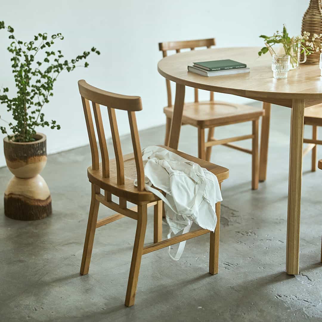 オーク無垢材の重厚で存在感のある雰囲気と軽やかな見た目を組み合わせたチェアです。