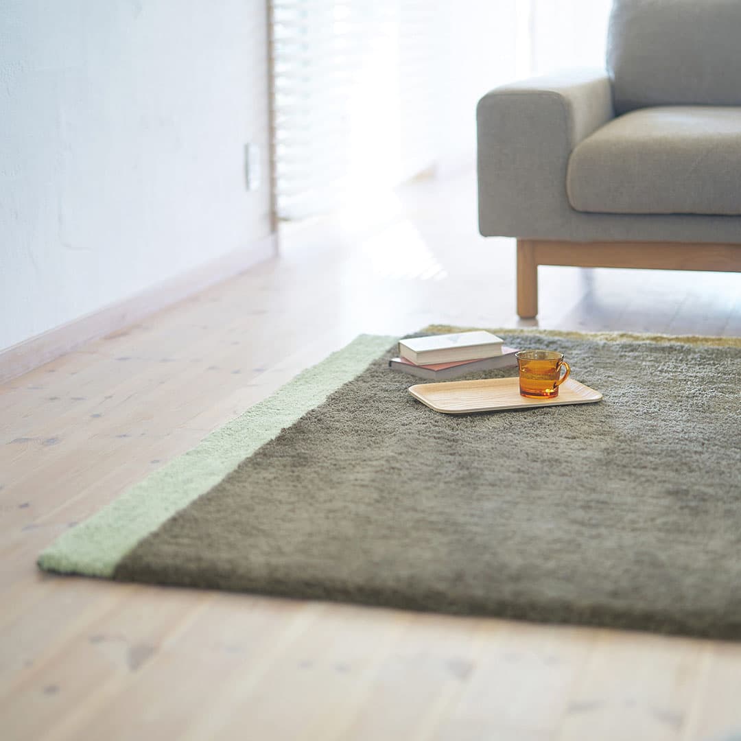 面積の大きな部分はベーシックな色味で、様々な家具に合わせていただきやすいラグです。