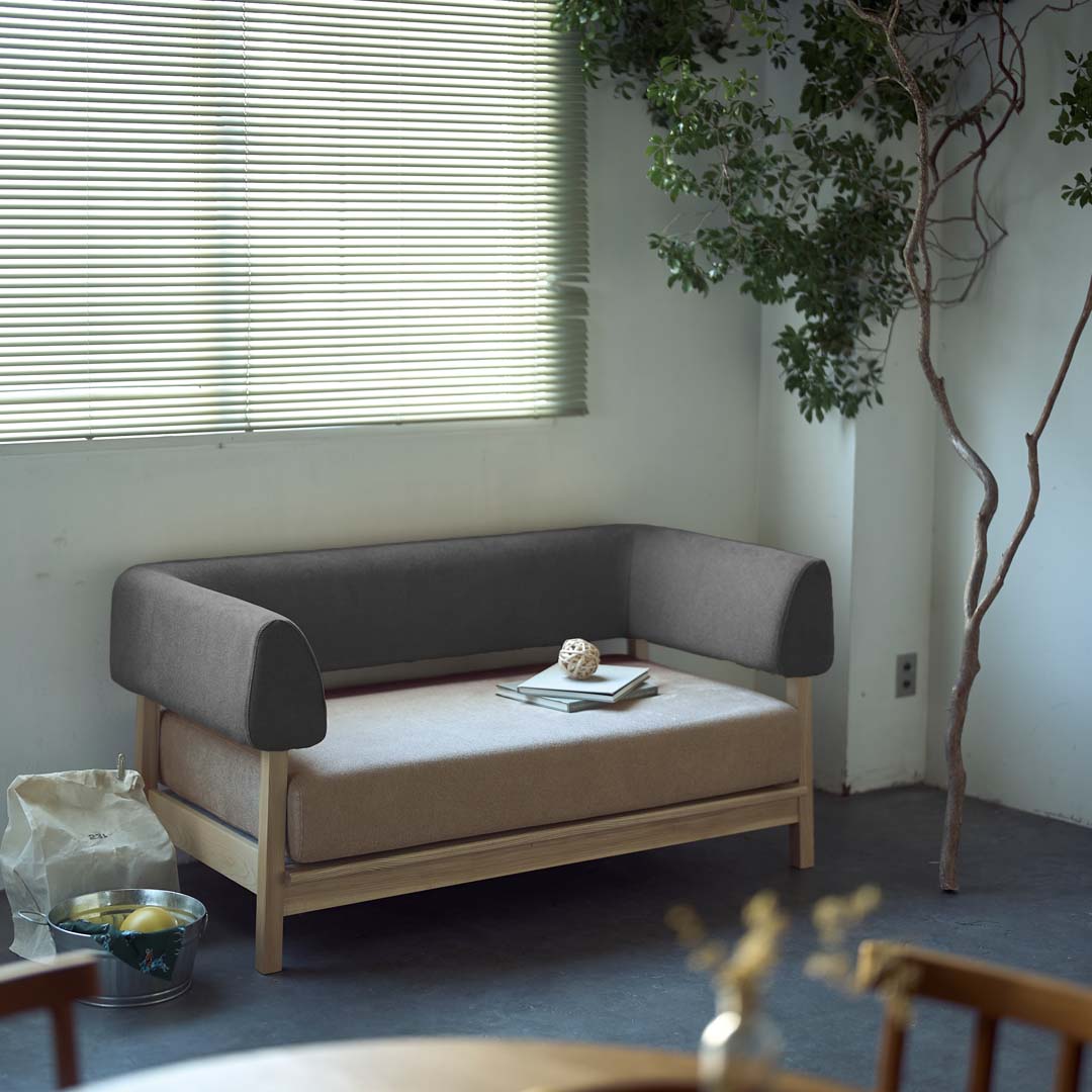 優しい雰囲気の背もたれおカラーと、ベージュの座面を組み合わせたツートンカラーの2人掛けソファです。