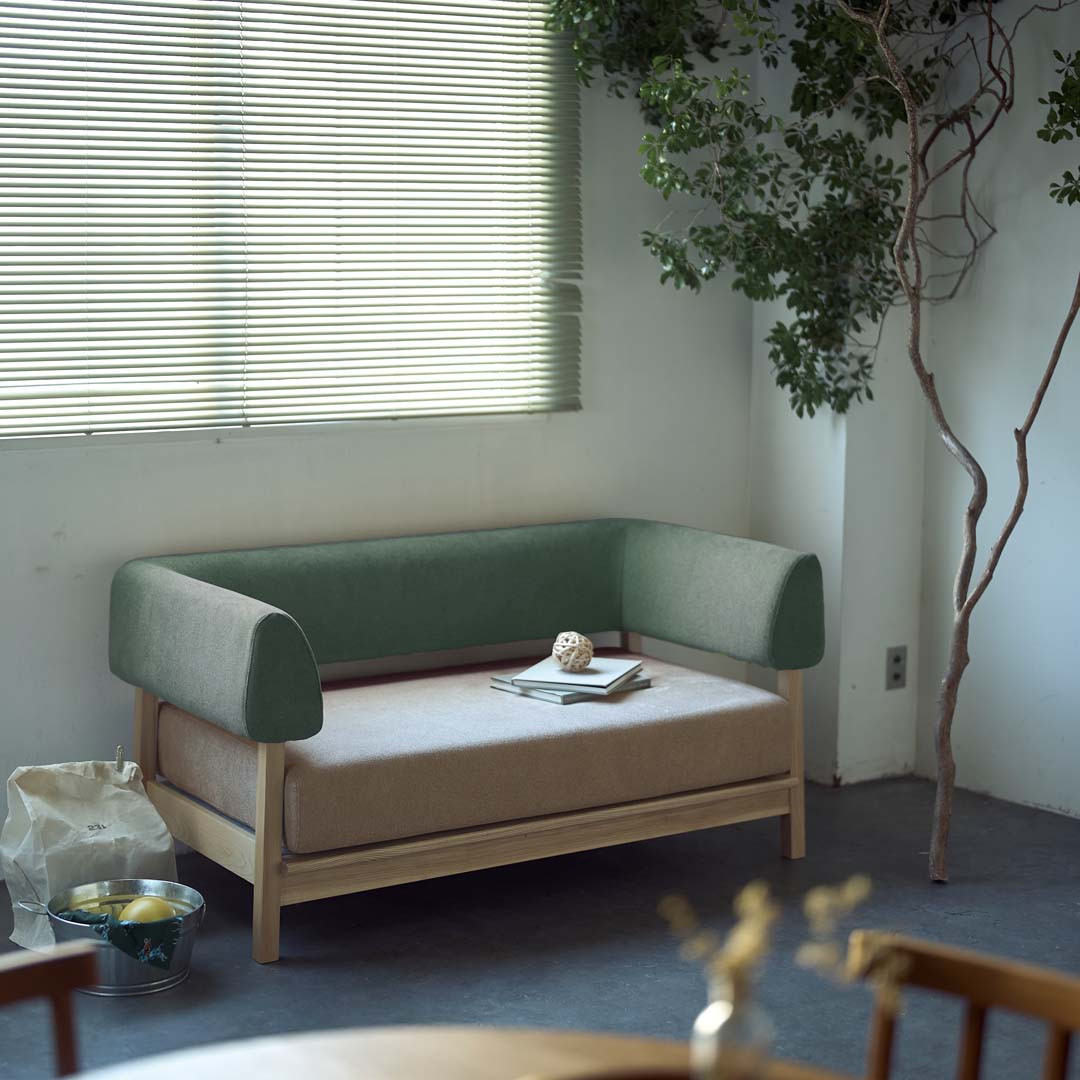 優しい雰囲気の背もたれおカラーと、ベージュの座面を組み合わせたツートンカラーの2人掛けソファです。