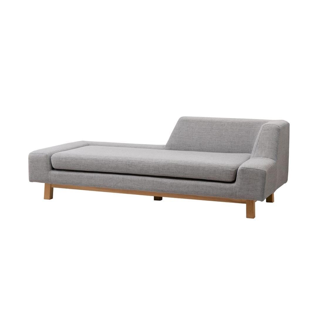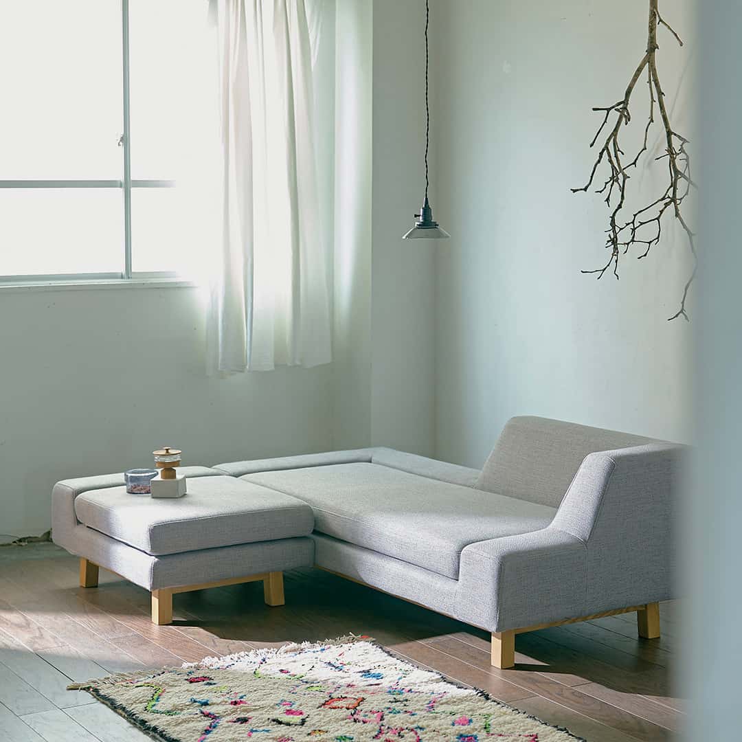 様々な座り方、くつろぎ方を提案するソファフラットなベンチソファの一角に背を設けた左右非対称なデザインのソファ。