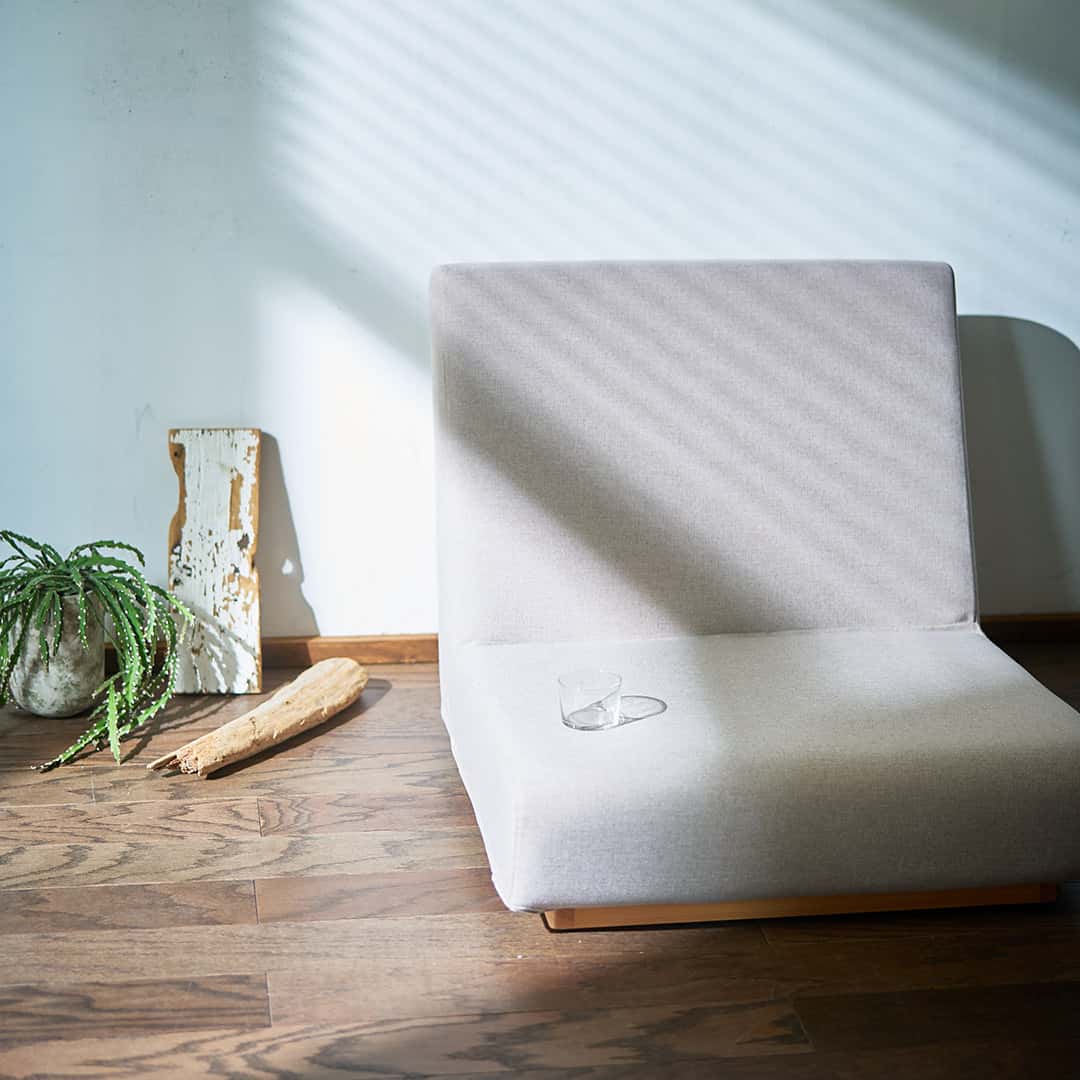 角材を組み合わせた脚フレームに、背と座一体型の本体フレームを配置した、座椅子のようなローソファ。