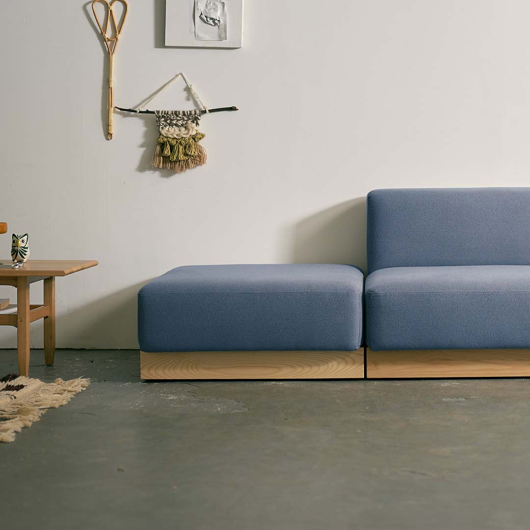 ボリュームのある本体とアッシュ無垢材を用いたベースで、シンプルながらも細部が特徴的なユニットソファです。